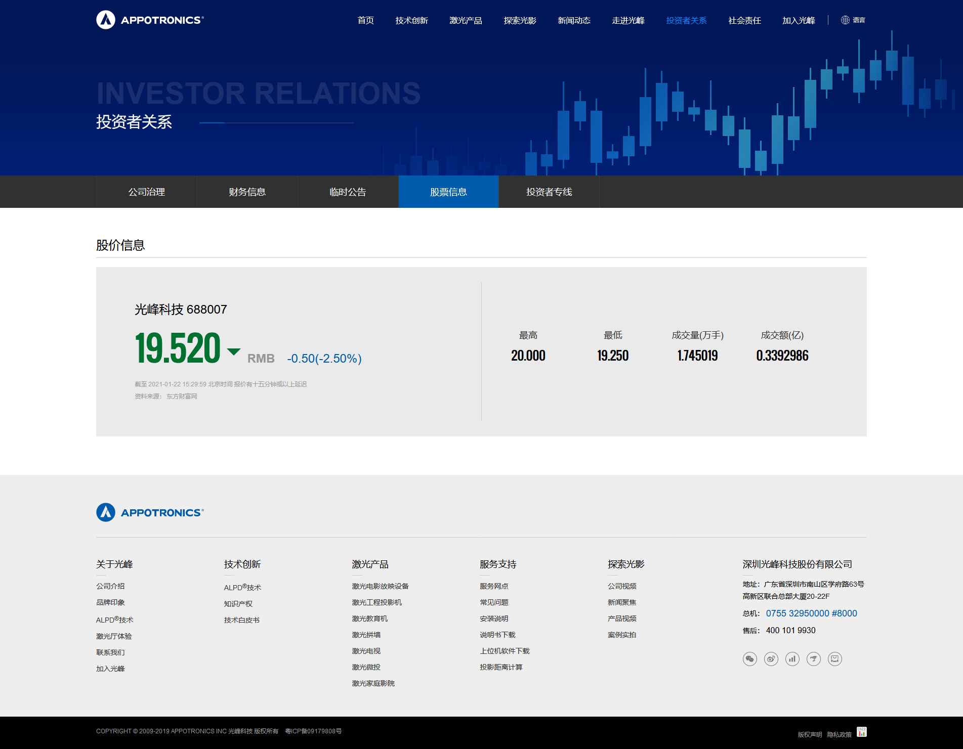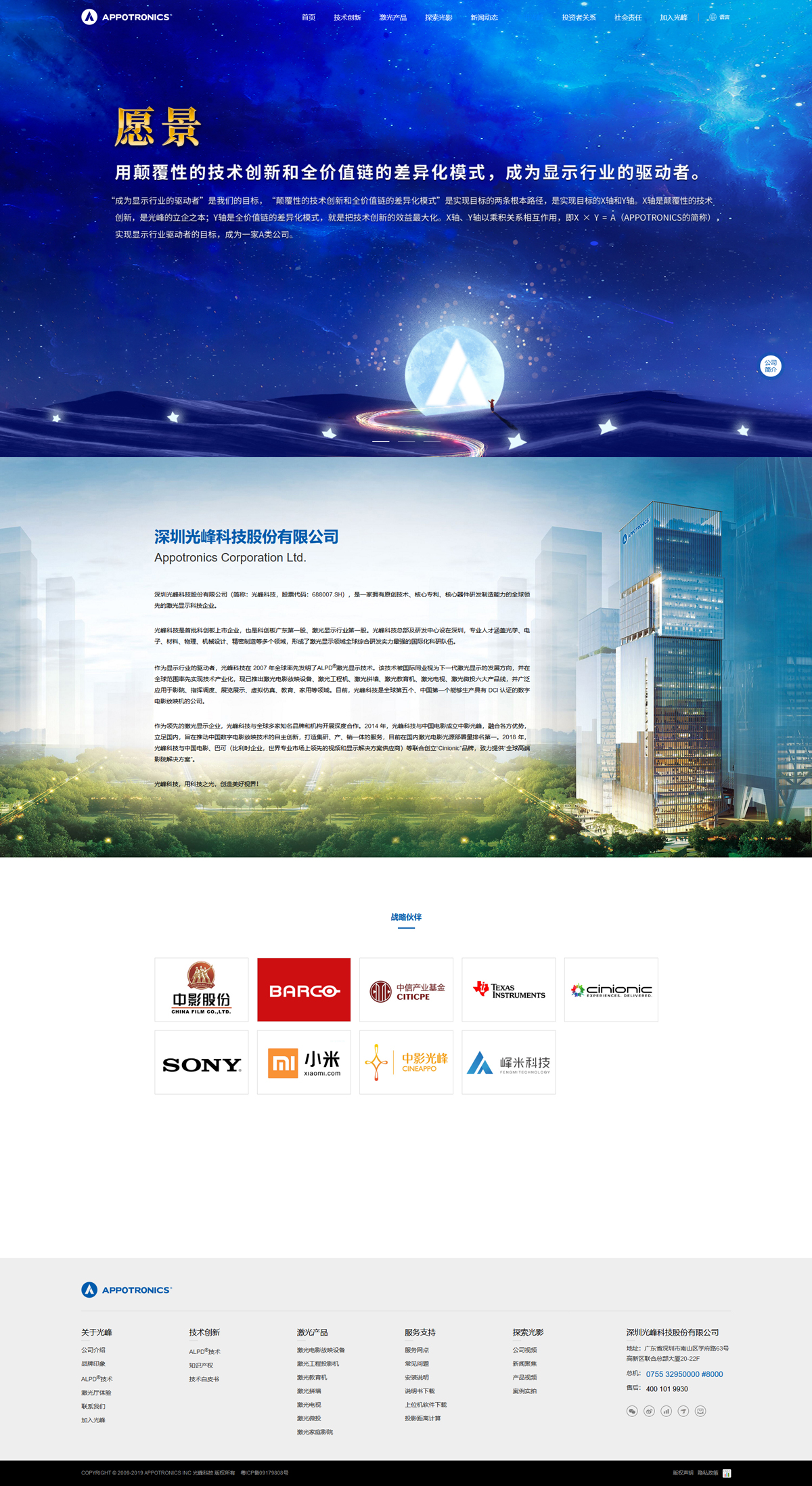 作為一家激光顯示產(chǎn)品企業(yè),網(wǎng)站建設(shè)需要展示出公司的核心技術(shù)優(yōu)勢,在內(nèi)容展示中融入案例視頻形式,讓產(chǎn)品一目了然,并把公司財(cái)務(wù)信息、股票信息等都充分展示在網(wǎng)站里面,增加客戶對公司的認(rèn)知。