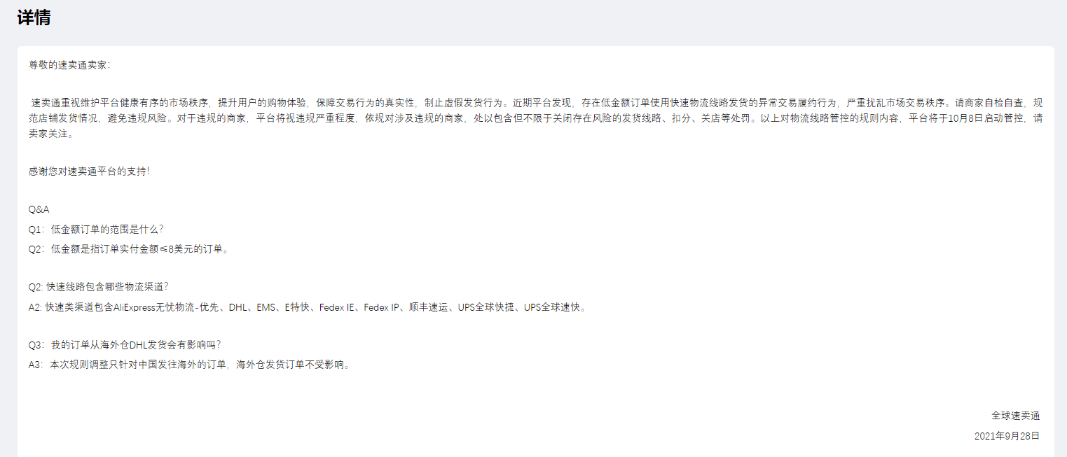 在了解速賣通刷單的必要性和方法之前,速賣通賣家首先有清晰的認(rèn)知,外包第三方刷單公司補(bǔ)單必死無疑,就是在2021年10月8號開始,速賣通平臺就發(fā)布了相關(guān)的公告。下面,eGoBest給大家分享為什么給第三方刷單公司刷單很不安全。