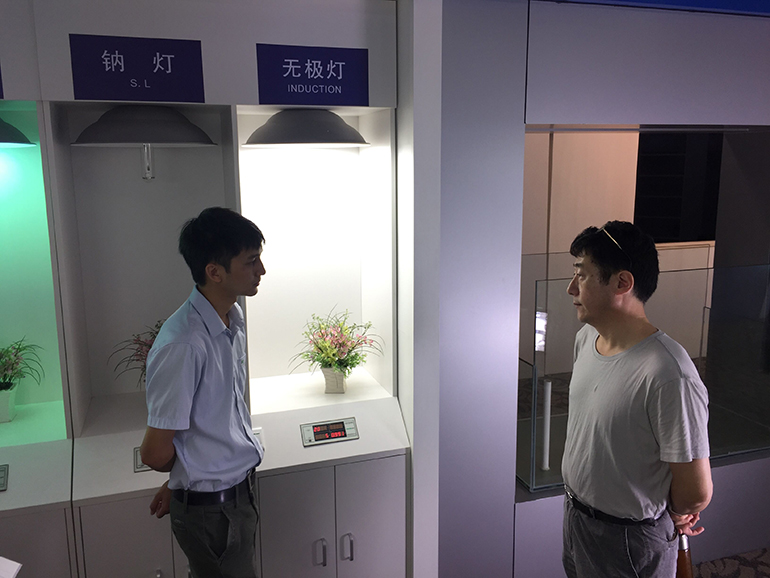 何教授在向eGobest的陳景新經(jīng)理介紹無(wú)極燈的發(fā)光原理以及與市面上的金鹵燈、節(jié)能燈、鈉燈之間的區(qū)別。目前市面上的節(jié)能燈因?yàn)榄h(huán)保性不高,正在慢慢被淘汰,而無(wú)極燈正趨向于興起發(fā)展。