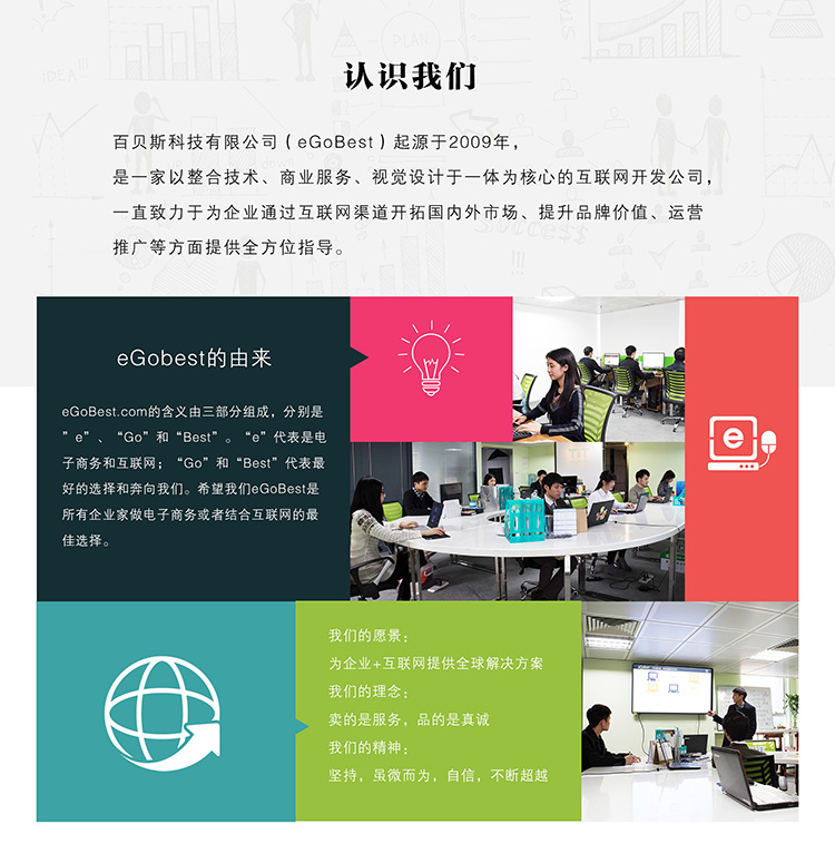 eGoBest百貝斯科技起源于2009年,目前主要核心的的設(shè)計(jì)開發(fā)和運(yùn)營骨干有10人。對(duì)于eGoBest團(tuán)隊(duì),我們的視覺設(shè)計(jì)總監(jiān)關(guān)嘉英自評(píng)道:“有時(shí)候簡(jiǎn)直是天馬行空!”這或者與團(tuán)隊(duì)成員的海外跨境電商網(wǎng)站技術(shù)開發(fā)背景有關(guān)。團(tuán)隊(duì)以技術(shù)總監(jiān)林華章為首,大都有過與來自美國、英國、保加利亞等國家華人客戶的合作的跨境電商項(xiàng)目開發(fā)經(jīng)歷。國外成熟、大膽而又不失文化底蘊(yùn)的設(shè)計(jì),大大擴(kuò)闊了這個(gè)年輕的設(shè)計(jì)團(tuán)隊(duì)的視野,也加強(qiáng)了他們做具有國際化審美特色的設(shè)計(jì)作品的決心?!叭绾文軌蜻_(dá)成商業(yè)與技術(shù)的完美融合,通過設(shè)計(jì)與技術(shù)手段使品牌運(yùn)營與客戶體驗(yàn)水乳交融,是eGoBest的課題。“eGoBest經(jīng)理陳景新如是說。