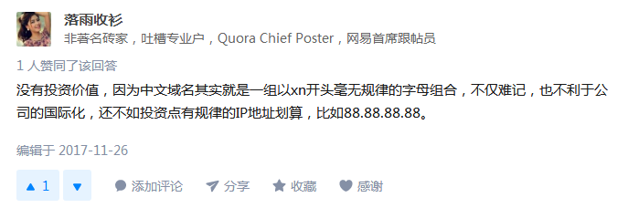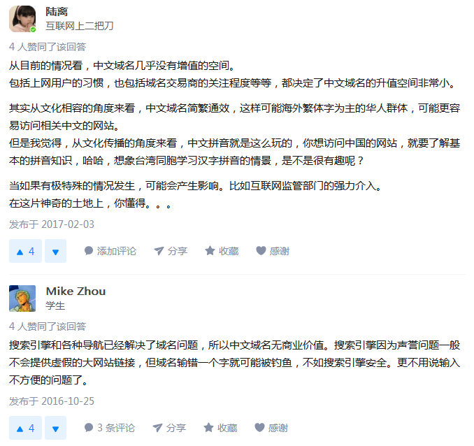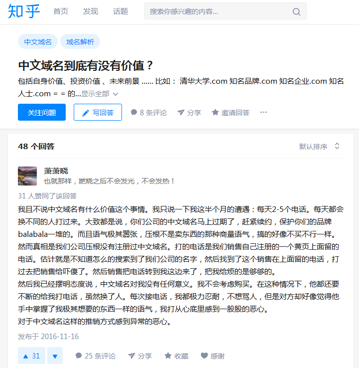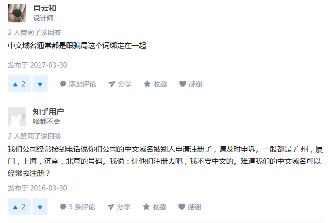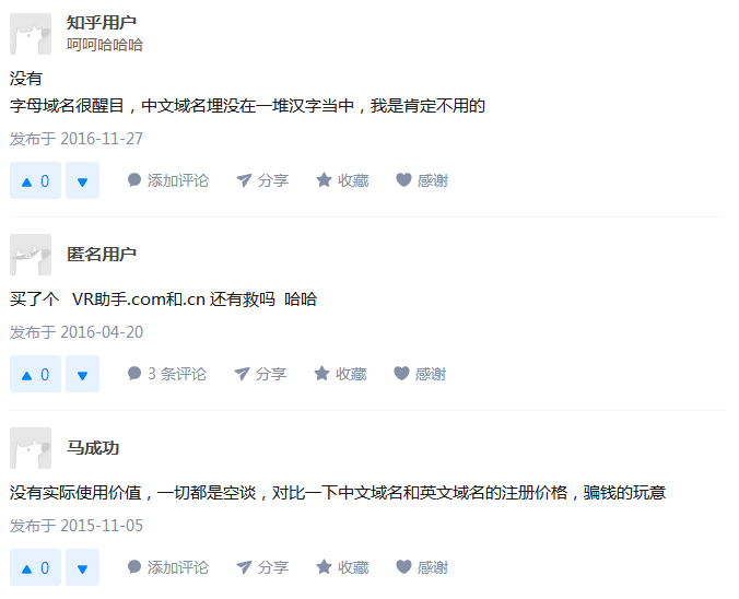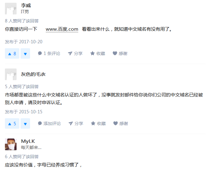 當(dāng)然,網(wǎng)上在百度或者知乎平臺上還有很多關(guān)于中文域名騙局和無用論的說法,我就不重復(fù)了,大家有興趣也可以在百度搜“中文域名騙局”,下面我就附上一些知乎平臺上一些觀點。