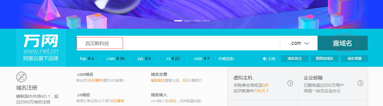進到萬網(wǎng)的官網(wǎng)后,你只要在域名注冊查詢欄輸入你要注冊的中文域名,單擊查詢即可。比如搜:百貝斯科技