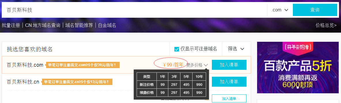 單擊搜索,就會出現(xiàn)中文域名的價格。以.com后綴的中文域名為例,一年其實就是99元,買10年也才990元。當(dāng)然,如果選擇其他的后綴會更加便宜。