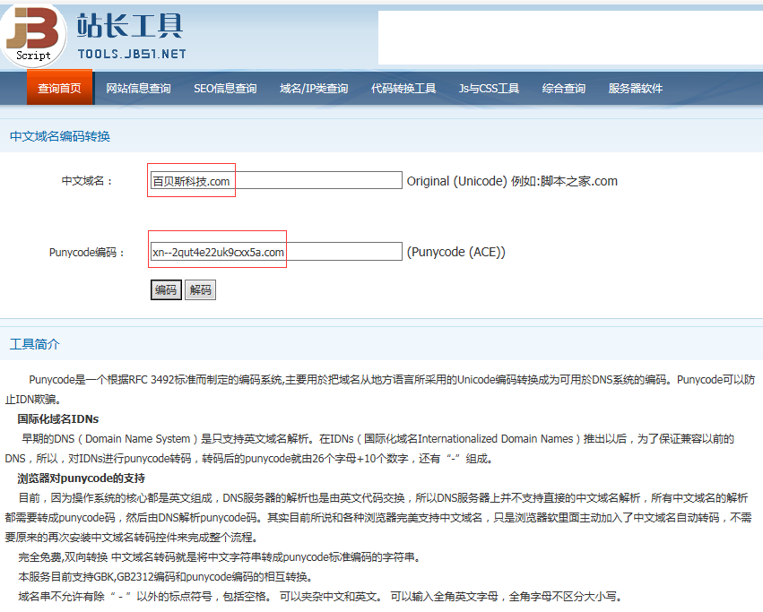 如果大家不懂,可以百度搜“中文域名轉(zhuǎn)碼”,就有很多轉(zhuǎn)碼網(wǎng)站讓你知道中文域名真正的字母域名是什么?如一個中文域名轉(zhuǎn)碼查詢平臺:http://tools.jb51.net/punycode/